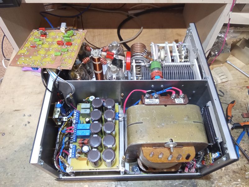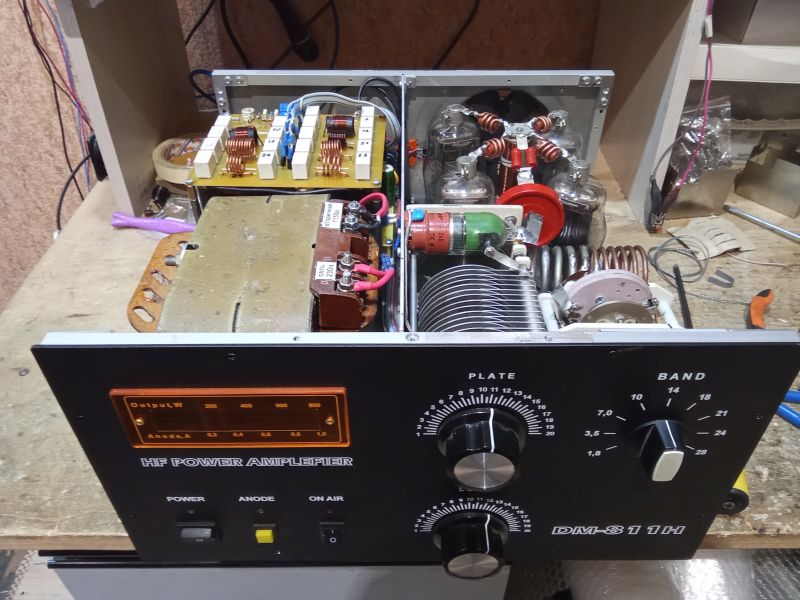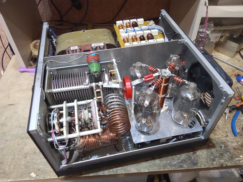 | Не прошло и 13-ти лет, как набрались запчасти для ещё одного усилителя...не пропадать же добру...))))) В качестве индикаторов тока и выхода применён китайский двухстрочный с али.... Стандартная защита по току анода... Размер 350х350х190мм....Корпус только-только...)))...Какой был...))))